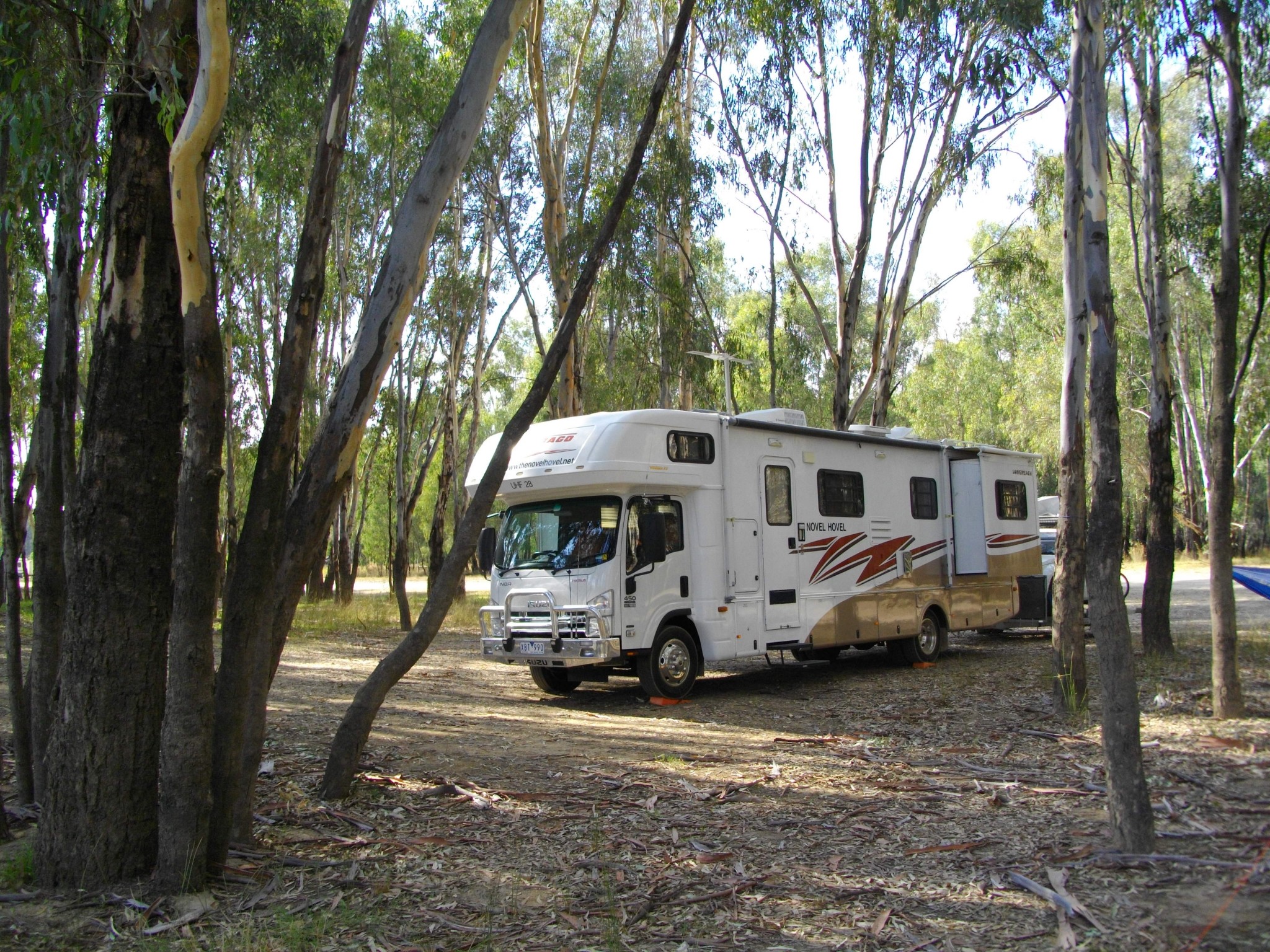 to see the State Park but on the way in we blew two tyres on the trailer and bent a wheel (and yes, there’s only one spare) so we are stuck here for the night til we offload and take all our bits to Echuca for fixup. Mind you its a nice place to be in the middle of a forest by the Murray.