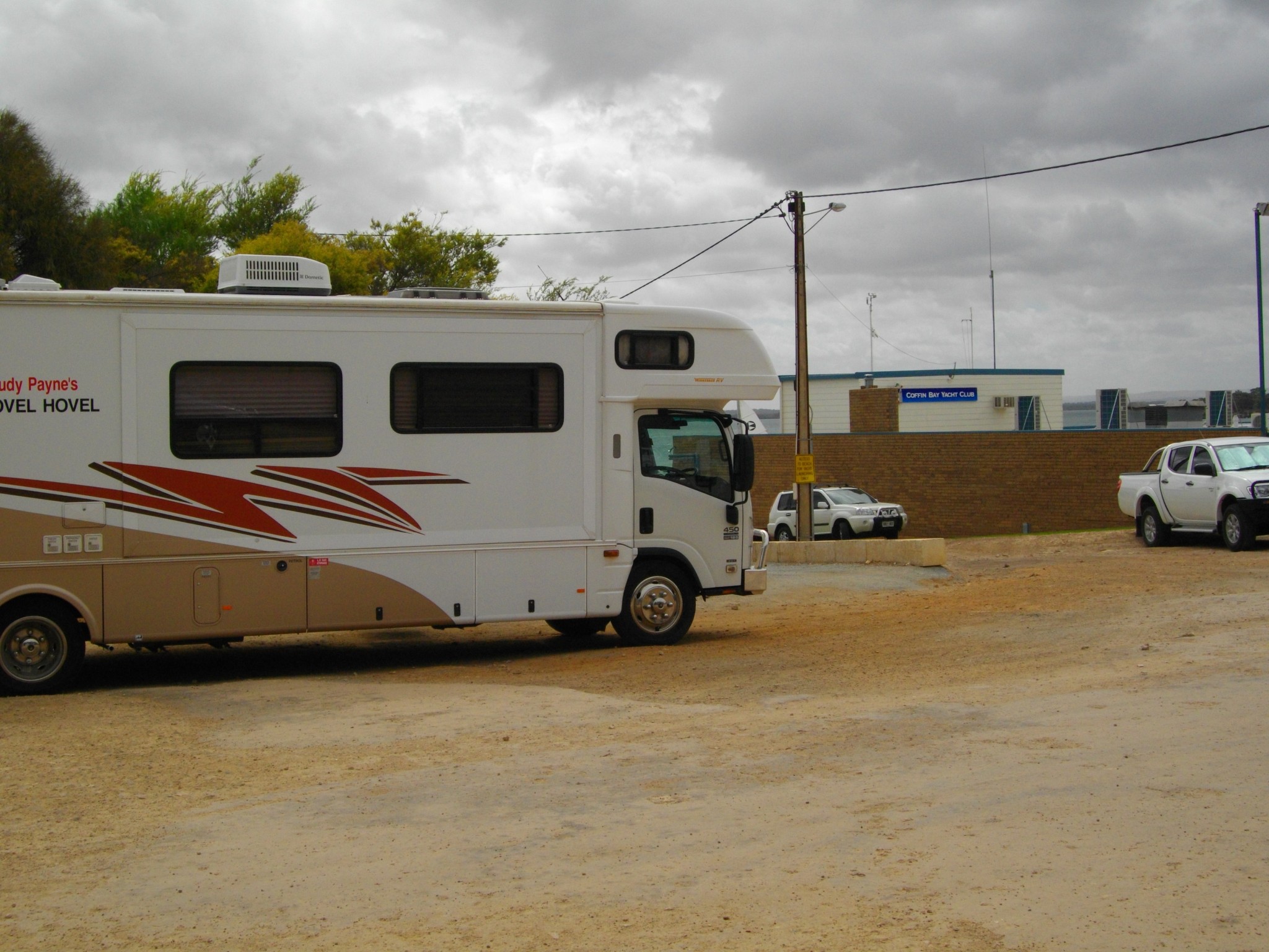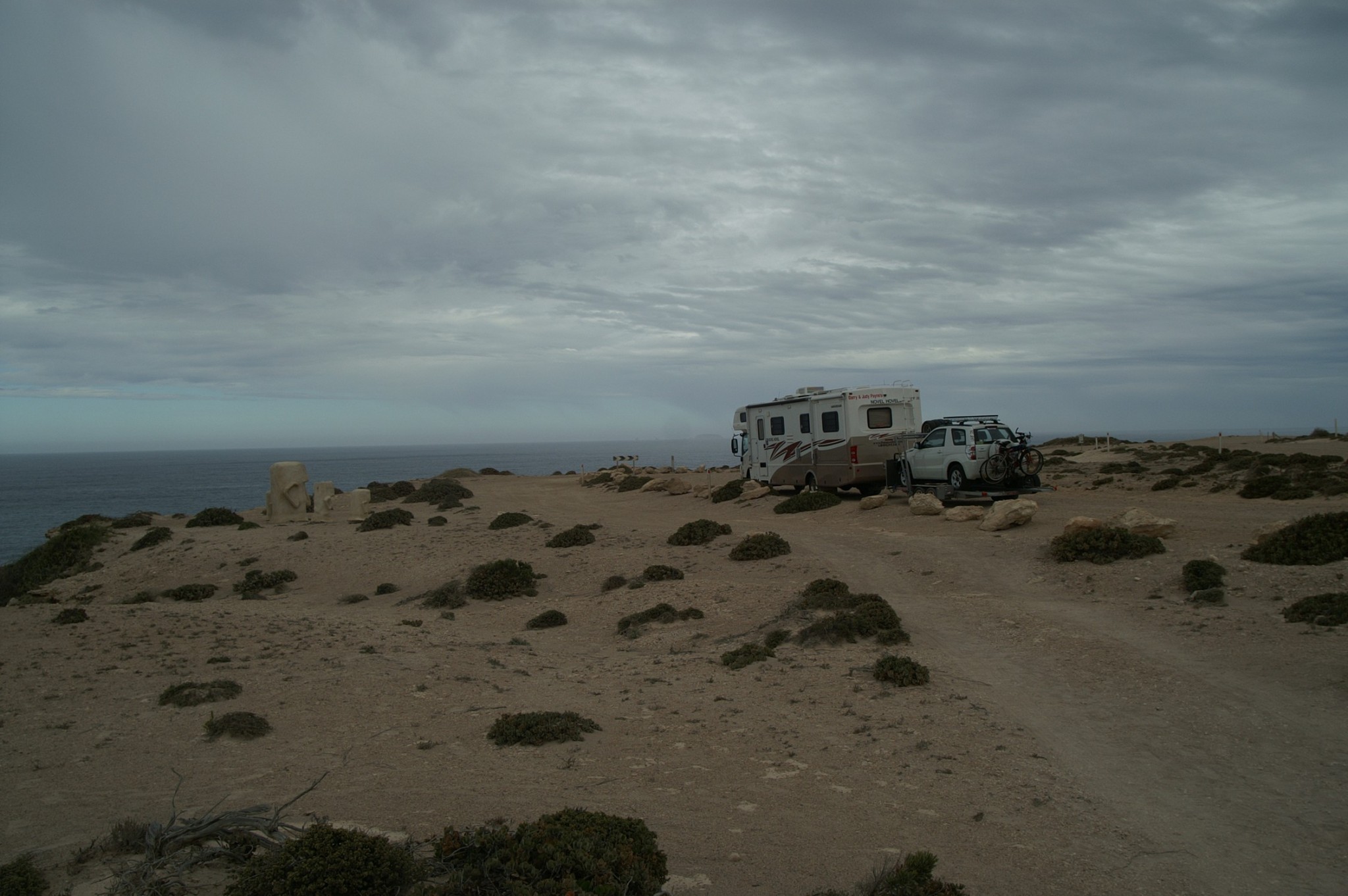 Filled the tank in Streaky Bay at $1.61, the dearest so far (116 litres, you do the math). We’re averaging 22.5l per 100km even with 60 – 70 km /hr winds hamering us most of Monday and Tuesday. We have opted to van park yesterday and today to prepare for the Eyre Highway/Nullarbor crossing ie top up water, fuel, tyres, laundry, food etc. Ceduna is on the water and quite an interesting place. Very large and very obvious indigenous population and from what I’ve seen a very active police presence, but everything seems very expensive. Like 1 litre of milk $2.55 at the supermarket.