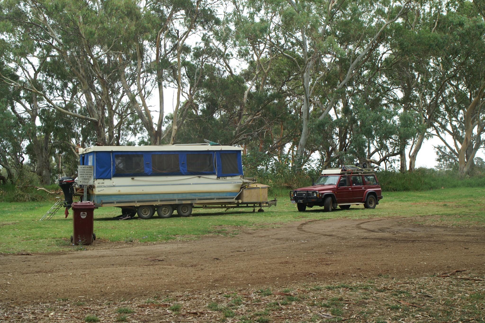 Check out the houseboat on trailer. Bob and his wife have been traveling for 15 years, now and again launching their accommodation and heading up river or downstream or just living in it by the roadside. All towed by an old GQ diesel Patrol.
