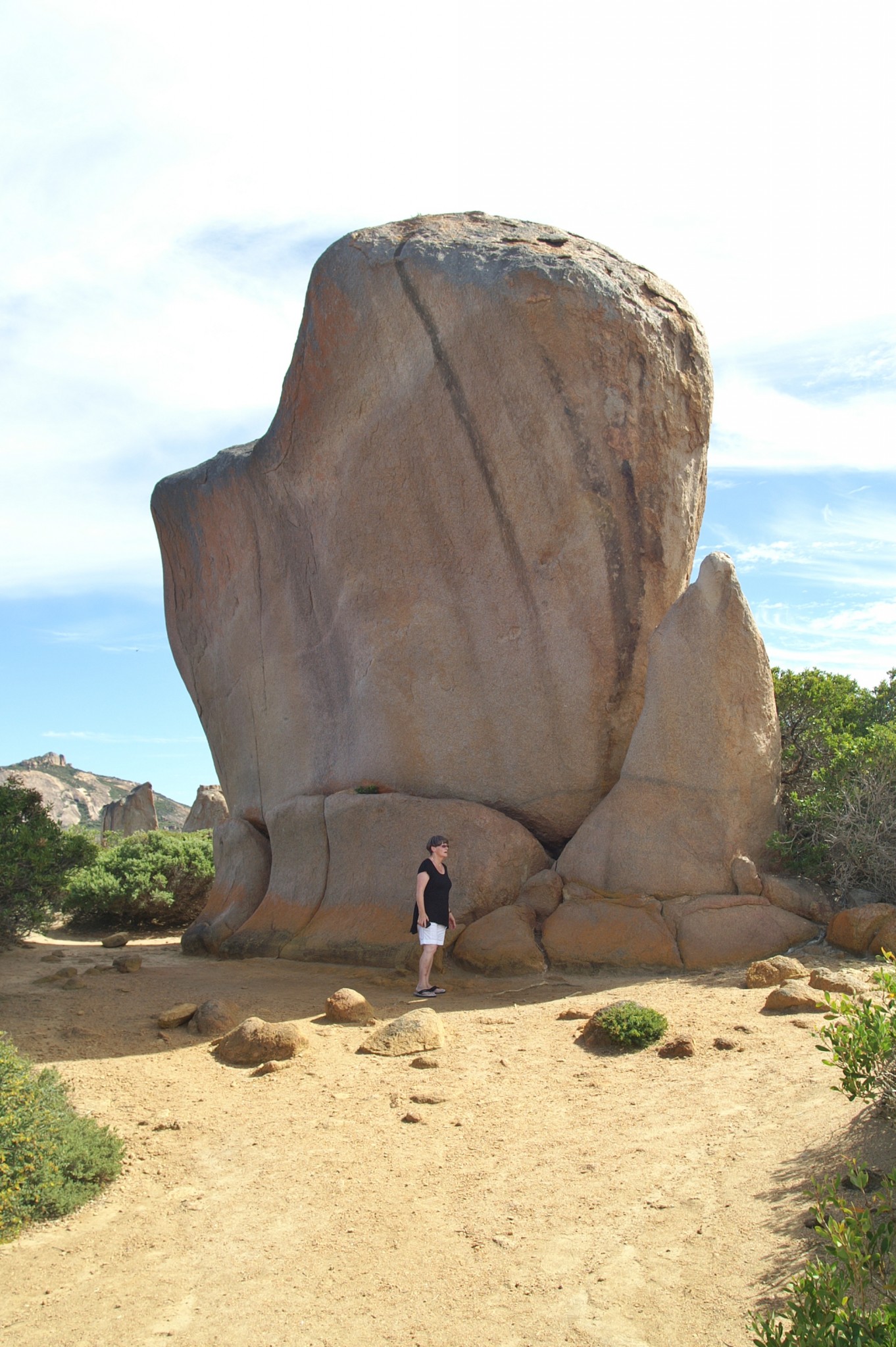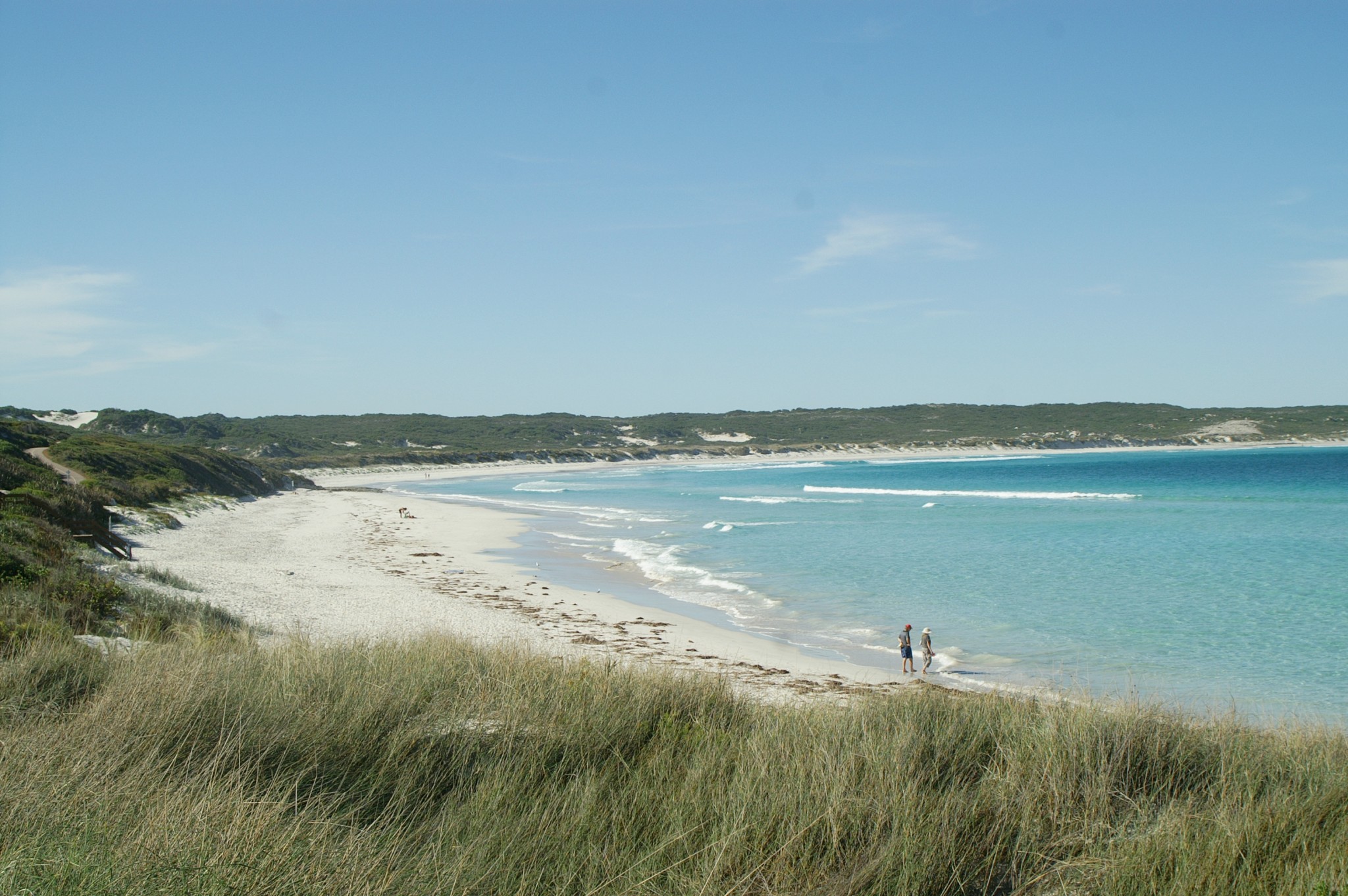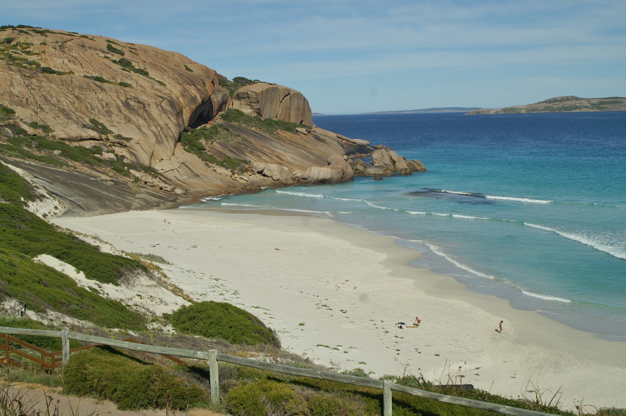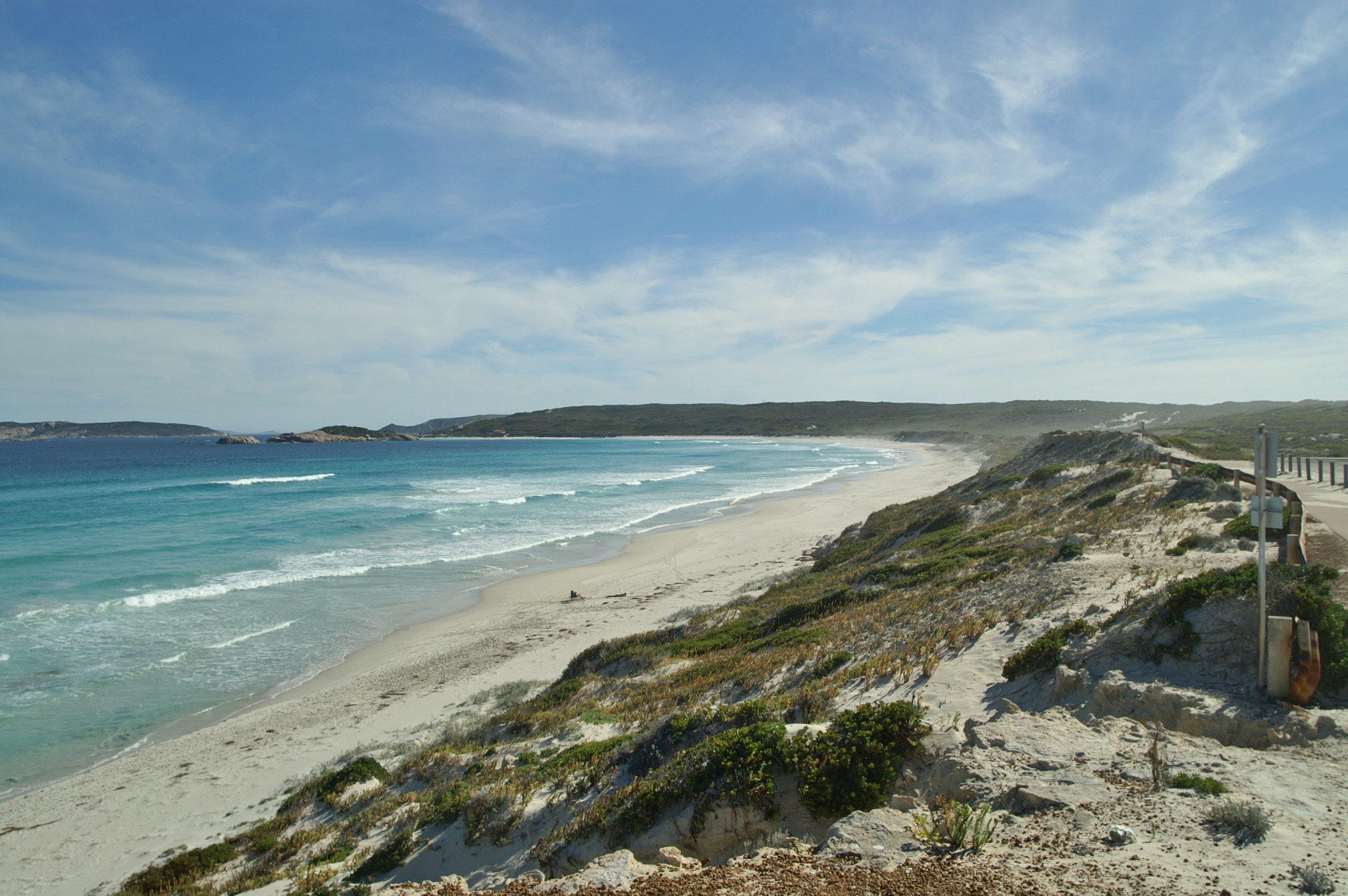 Then it got better still. We took in Cape Le Grand on Friday. We even went swimming (well one of us went swimming the other just saved his own life in the water). You could see your own feet in 1.5 metres of water, it is so clear. Driving along the beach to your own private spot is just the bees knees. Cape Le Grand is a National Park managed by the Department of Conservation and Land Management (CALM) and it’s an example the rest of the country could follow – road acces is terrific, signage is good, access to the beaches is exemplary and it is just a lovely place to be and see. About 56 km out of Esperance it’s an easy drive through some of the most picturesque farm lands we’ve yet seen and all of it is GREEN.