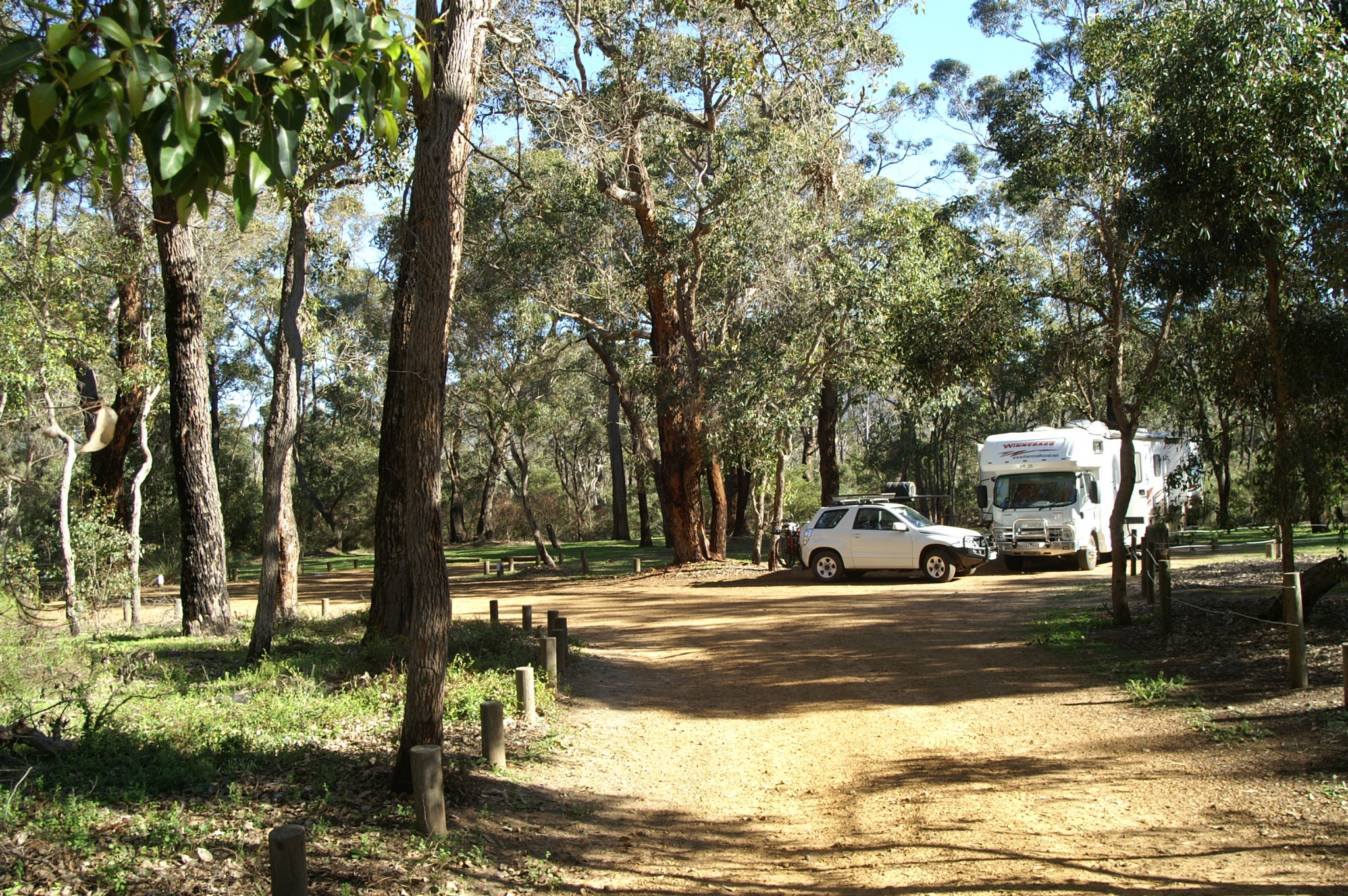 Well doesn’t the time slip by. Last post was on the 10th but that only took us up to the 6th or 7th of June. From Augusta we went back to Margaret River where we eventually found the farm stay we’ed been told of. Well of course we entered the roadway from the wrong end – we were coming from the south and the instructions in the book directed only from the north. Anyway we had our trusty sat-nav didn’t we? It found the right road just from the wrong direction so about 7/8 of the way up the road as it got narrower and muddier I overrode the stupid thing and yelled at it to take us back. After negotiating a turn-around through eleventy leven feet of filthy muddy water we headed back to follow the directions in the book. By the time we got into the farm we looked like most farmers tractors – s..t up to the door handles. Anyway on arrival at Big Valley Farmstay we found a familiar vehicle – “The Bakers Den”, a very large silver and blue Denning coach conversion. We had crossed paths with this vehicle without spying its occupants all the way across the Nullarbor and then into Esperance. They bumped into Maggie Laytons friend Glenys Ferguson in Donnybrook who thought it was us but once put right was informed that they had seen us along the way. Well we finally met the Bakers – Margaret and Tony over drinks the next night. The story gets weirder – another couple from Victoria, Harvey and Sue joined us for drinks (as did Keith and Helen) only to discover that Margaret and Sue did their time as nurses together in training (a long way back), had retained mutual friends but hadn’t seen each other in 30 or so years. Life gets funny sometimes don’t it!
