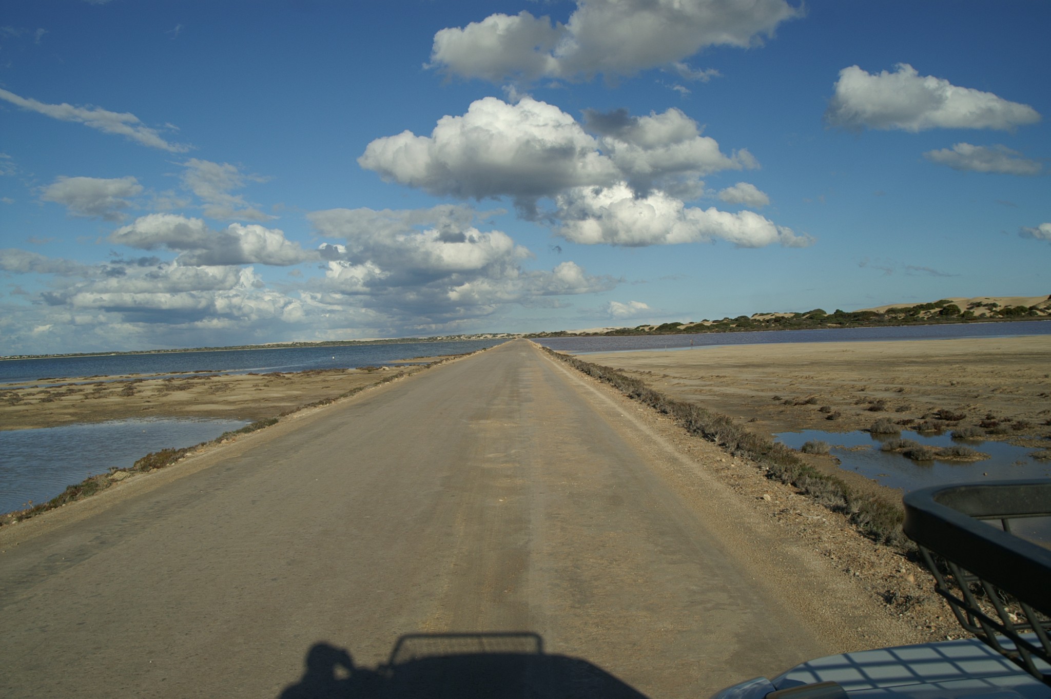 Back over the causeway, heading back to Penong the most unusual occurrence of pink and green water on either side caused occasion to pause….