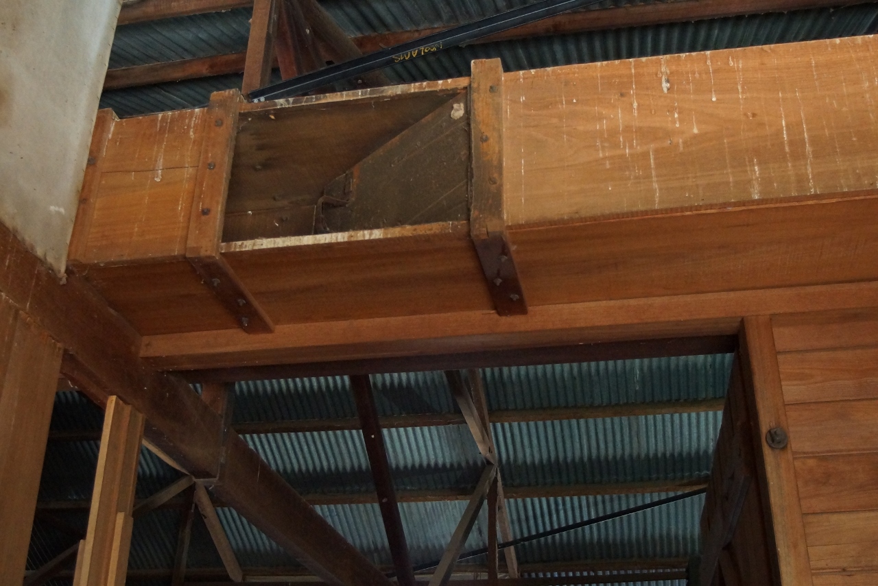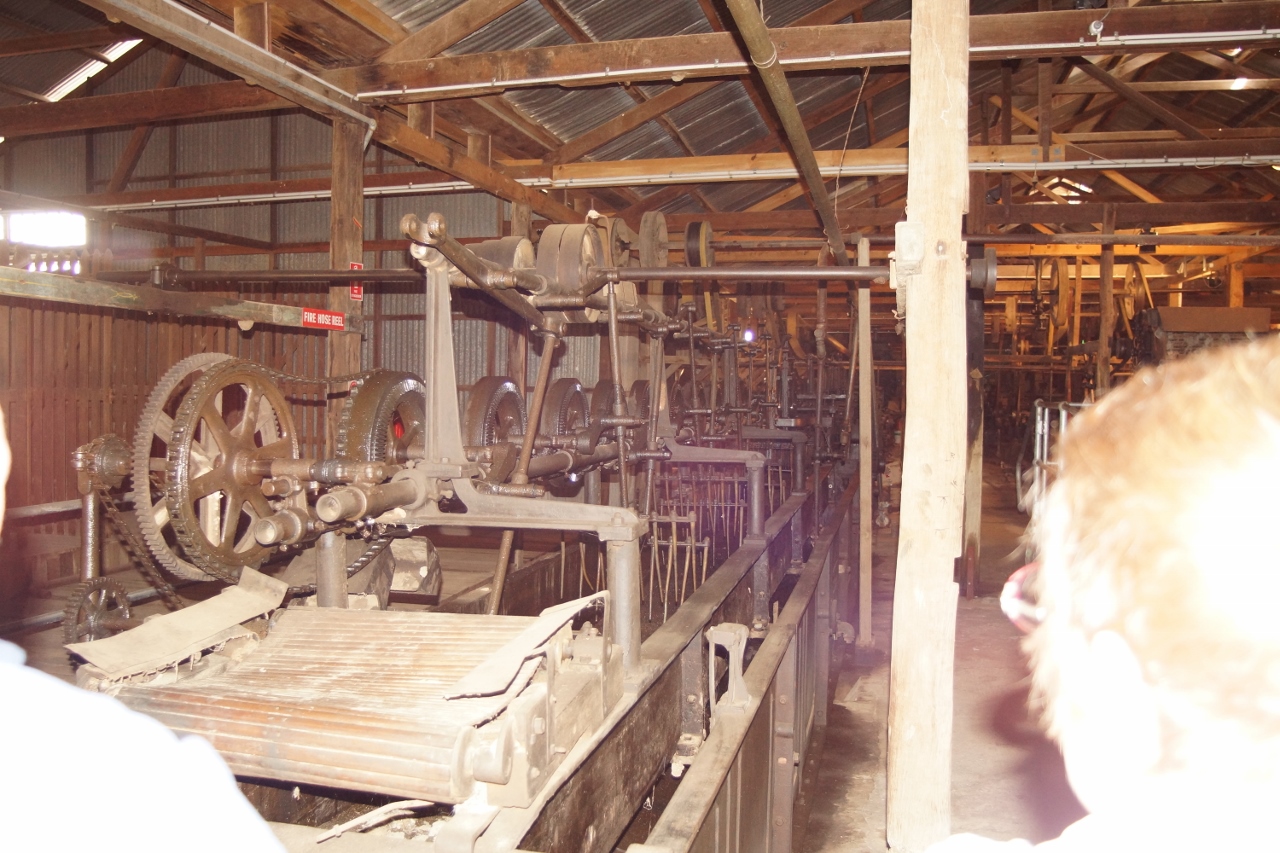 The wool is fed in one end, goes through a series of combs all operated by steam driven pulleys and ultimately through washes to dryers then is pumped upstairs where it exits the system through the little gate above the storage bin. There it is classed, moved manually over to the wool press and is bagged and branded ready for shipping.