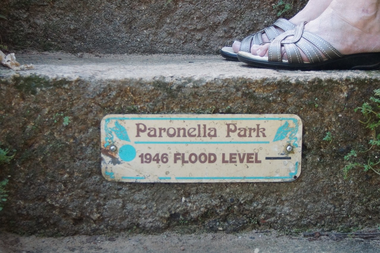 From the step marked 1946 flood level you are looking down into the picnic area near the base of the falls. The flood waters were deep.