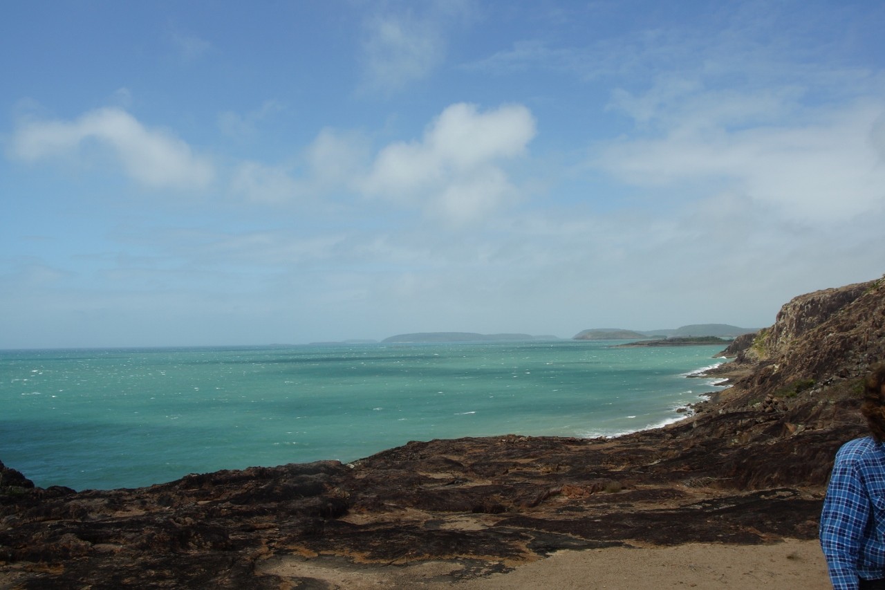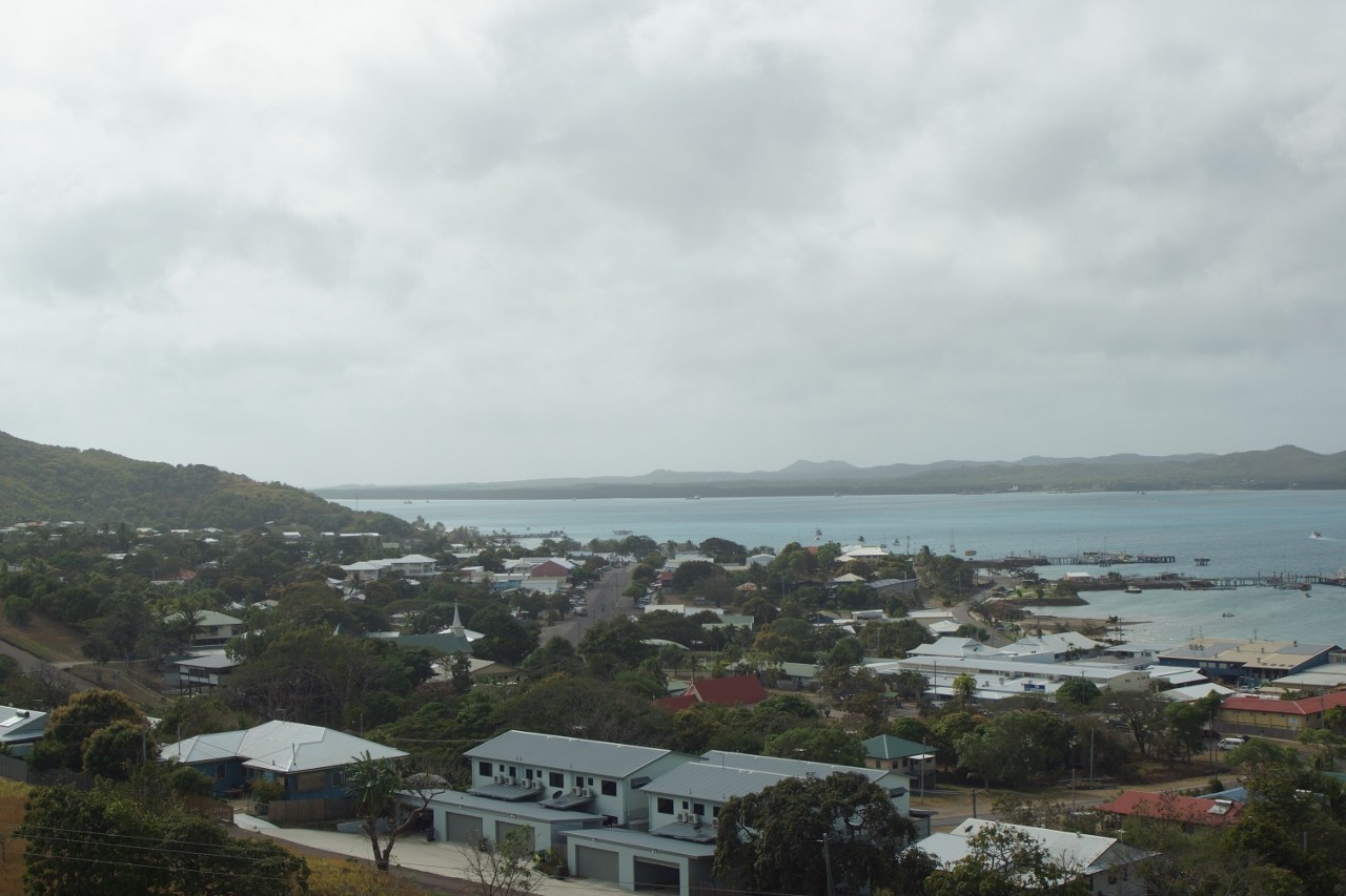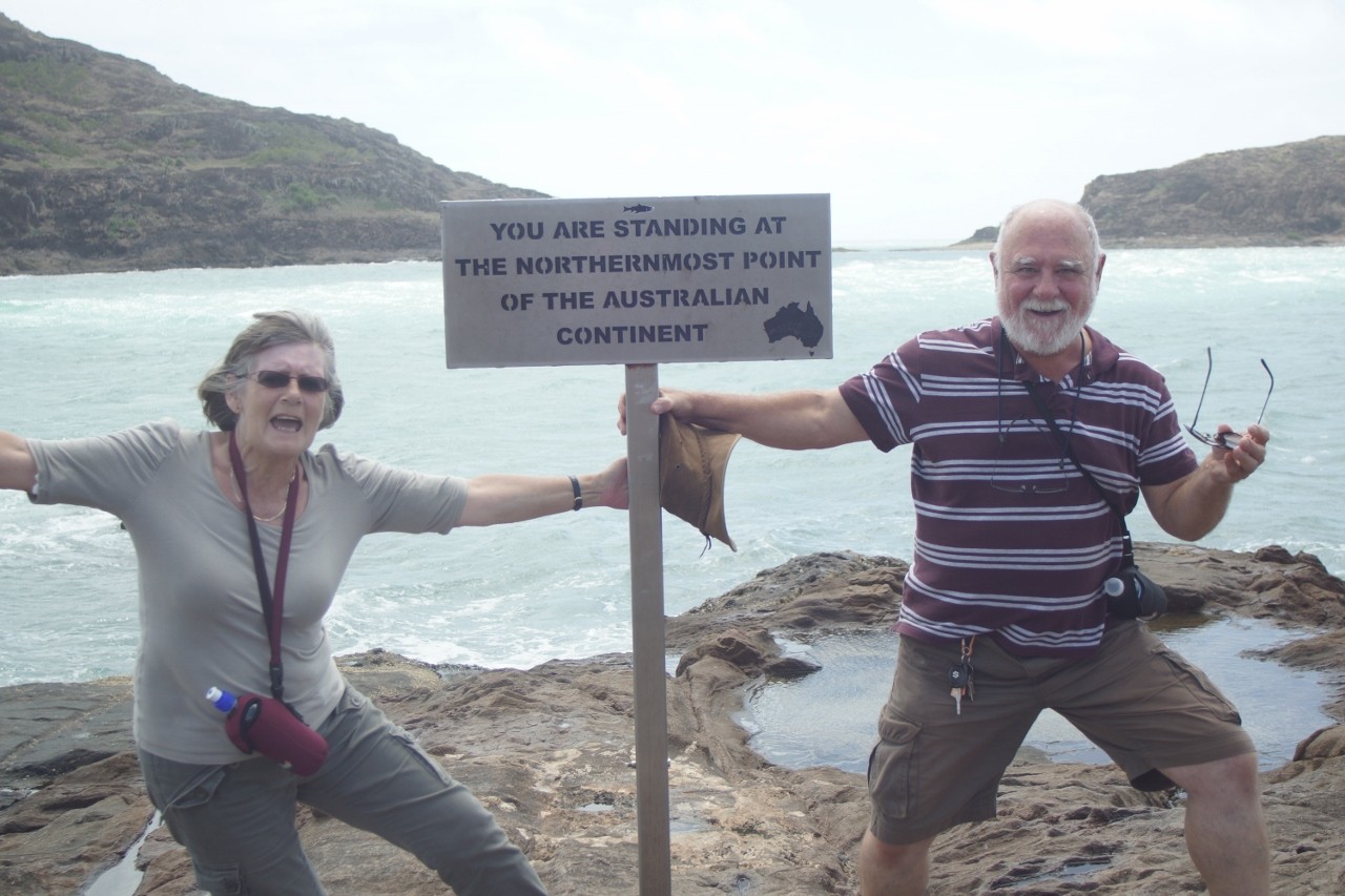 Not far to Siesia. Our map shows that the ferry service to Thursday Island operates out of both Punsand Bay and Seisia so a phone call to Punsand Bay Camping Ground because that’s where Alan & Barb are booked in seems like a good idea for this nights accommodation. Well says the man, your map is out of date – the ferry does not operate from here any more. So, Seisia would seem to be he best place to work from. In we go to the Seisia Camping Ground. For the privilege of putting up our own tent we gave them $48.00 per night but we did get a hut with a kitchen bench and sink and space to place our table and chairs under cover and dogs and horses to share it with. But, we did also get Joy and Tony as neighbours and that was real good cos they were a font of information. We put up the tent again and we didn’t argue once. And, despite the constant winds, horse intrusions and dogs over the next few days it stayed up. Whats more, we had a great view…
