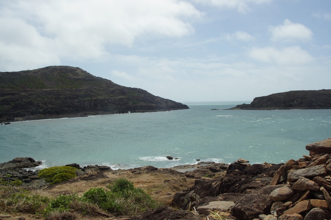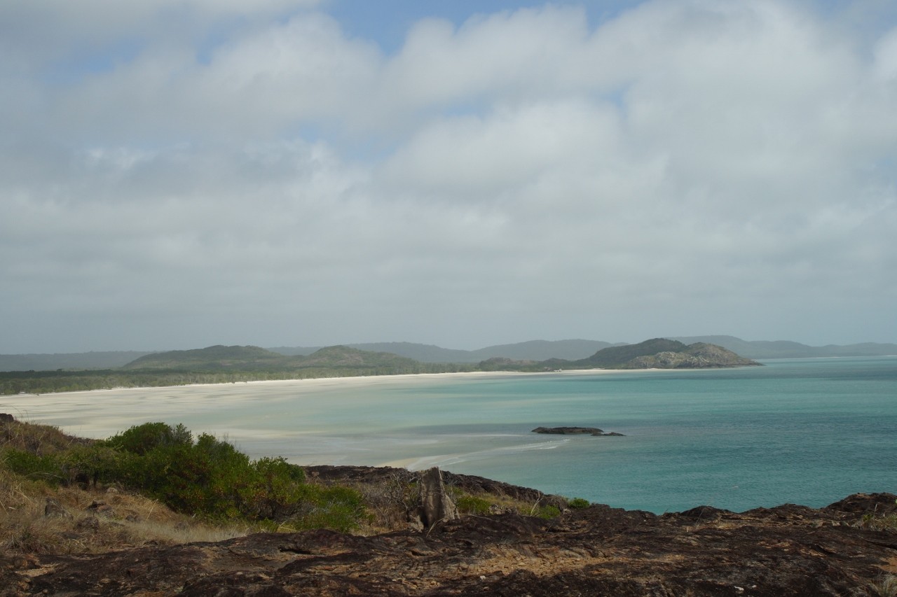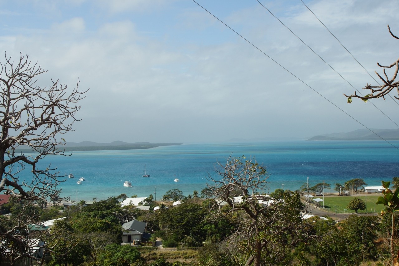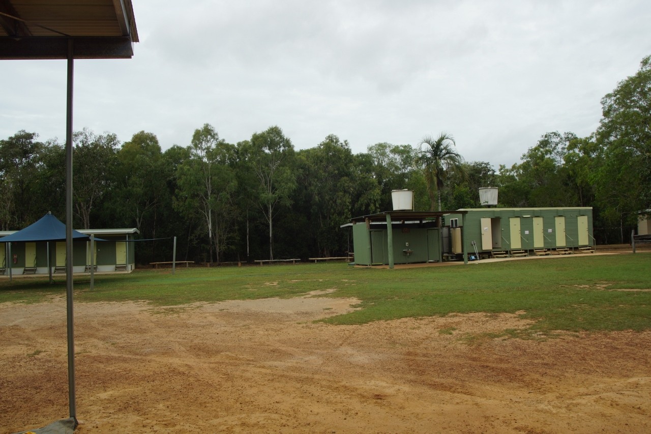 Not far to Siesia. Our map shows that the ferry service to Thursday Island operates out of both Punsand Bay and Seisia so a phone call to Punsand Bay Camping Ground because that’s where Alan & Barb are booked in seems like a good idea for this nights accommodation. Well says the man, your map is out of date – the ferry does not operate from here any more. So, Seisia would seem to be he best place to work from. In we go to the Seisia Camping Ground. For the privilege of putting up our own tent we gave them $48.00 per night but we did get a hut with a kitchen bench and sink and space to place our table and chairs under cover and dogs and horses to share it with. But, we did also get Joy and Tony as neighbours and that was real good cos they were a font of information. We put up the tent again and we didn’t argue once. And, despite the constant winds, horse intrusions and dogs over the next few days it stayed up. Whats more, we had a great view…