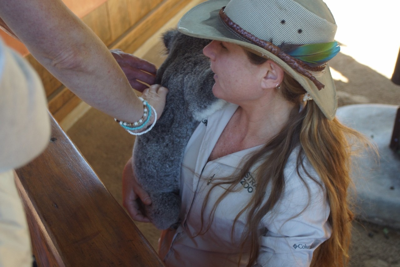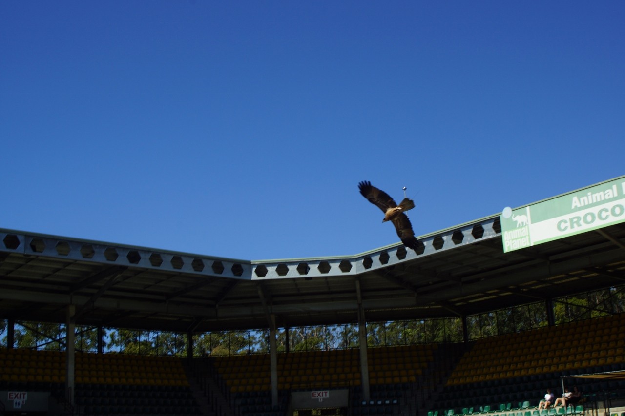 Had to go to the zoo to see all the crocodiles we didn’t see up north. Jude said that when she visited last, Australia Zoo was inhabited by Steve Irwin and he at least added some pizazz to the place. I thought it was just a zoo, whilst nicely laid out and beautifully kept it didn’t exhibit much character. The crocs were good and I would have liked to tease one as the keepers did, but you’re kept at a considerable distance from the beasts. Oh, you can pat kangaroos and koalas and even have your photo taken with an owl on your finger but you can’t cuddle a croc. If I remember rightly it cost nearly 50 bucks each to get in and that was concession and the limited choice of food stuffs within were all relatively expensive. A day out at the zoo for $150.00 is not a small investment for these two old pensioners but we did enjoy the show in the arena showcasing the birds of prey and a couple of crocs.