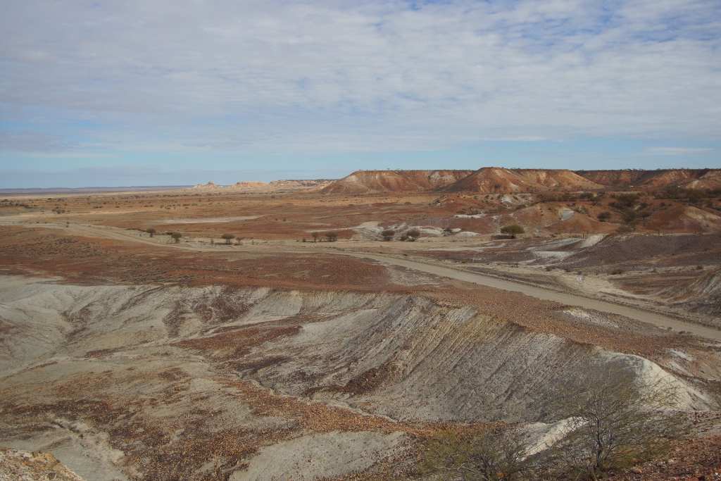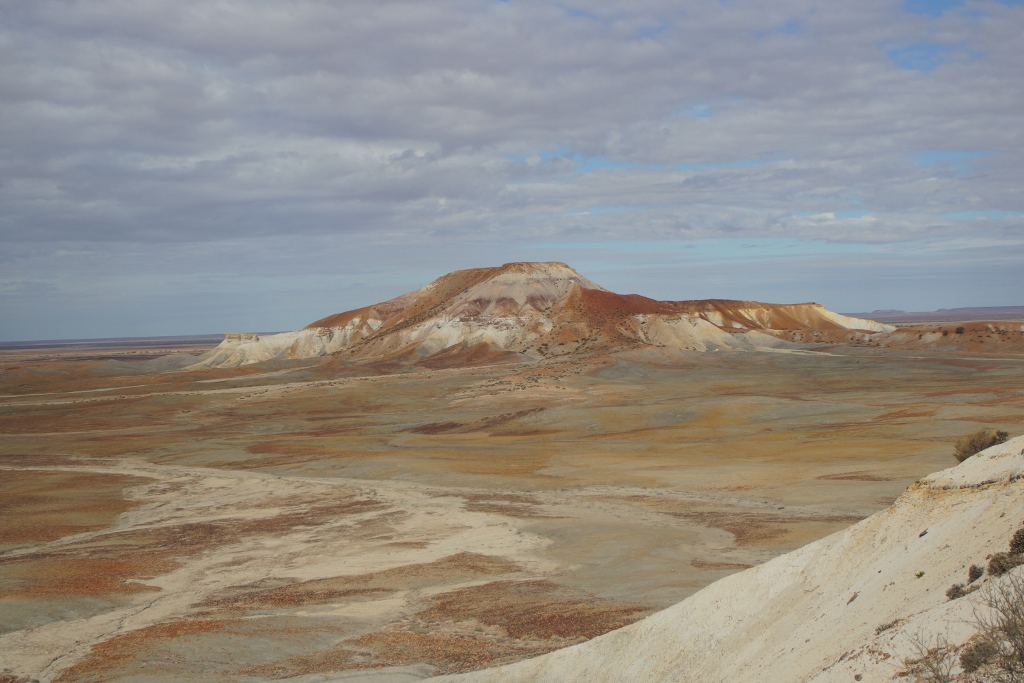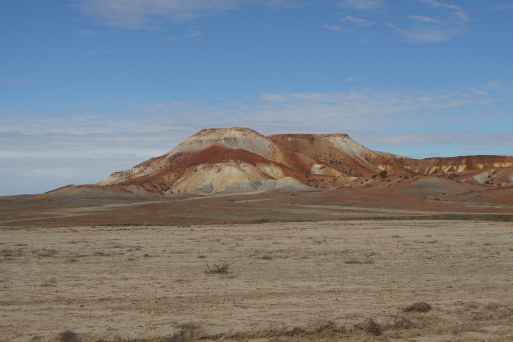 The Painted Desert is off the road back to Coober Pedy from oody doody. It is just another bad dirt road covered in sharp pointy stones and corrugations. Ya gotta wanta go there. As we turned into the lookout area some 40 or so k’s in, “BLAM”, another tyre bites the dust. We’re well prepared for this with our fresh can of spray in tyre fixit goo. Lets get to that after we’ve taken in the sights. And what sights they are. This outlook is incredible and I have to say the photos following don’t do it justice……