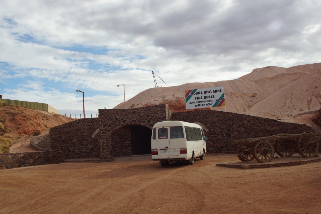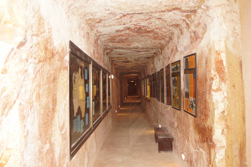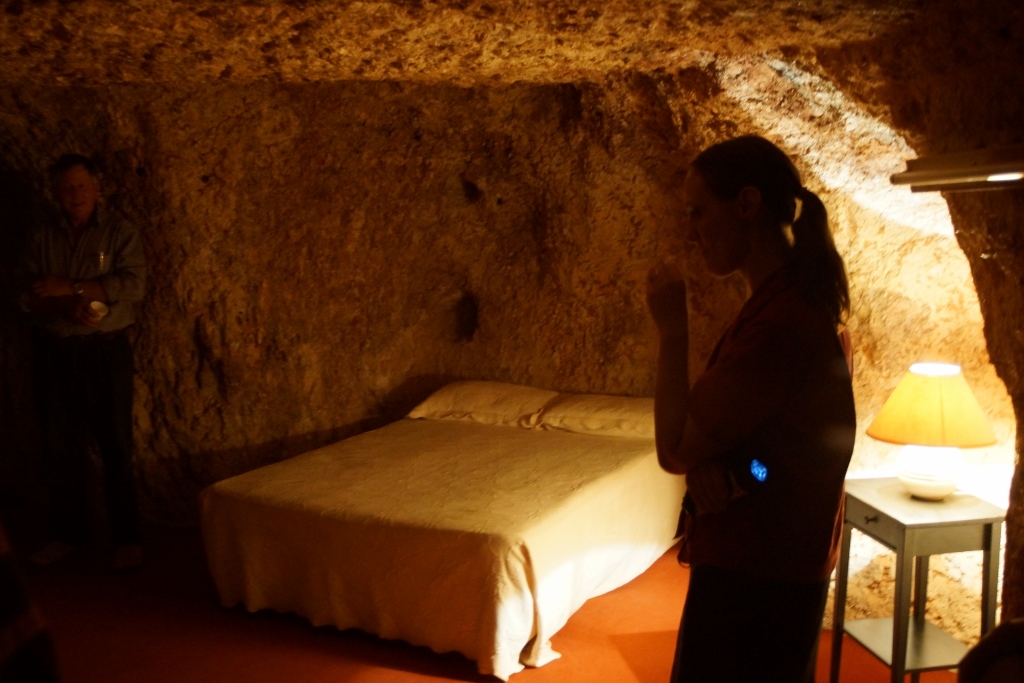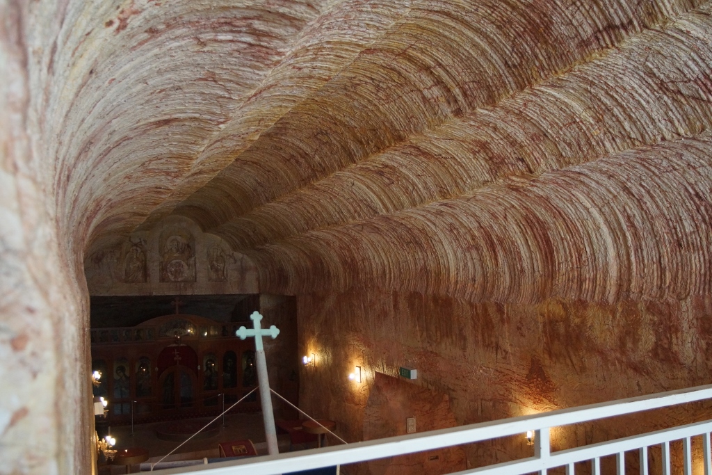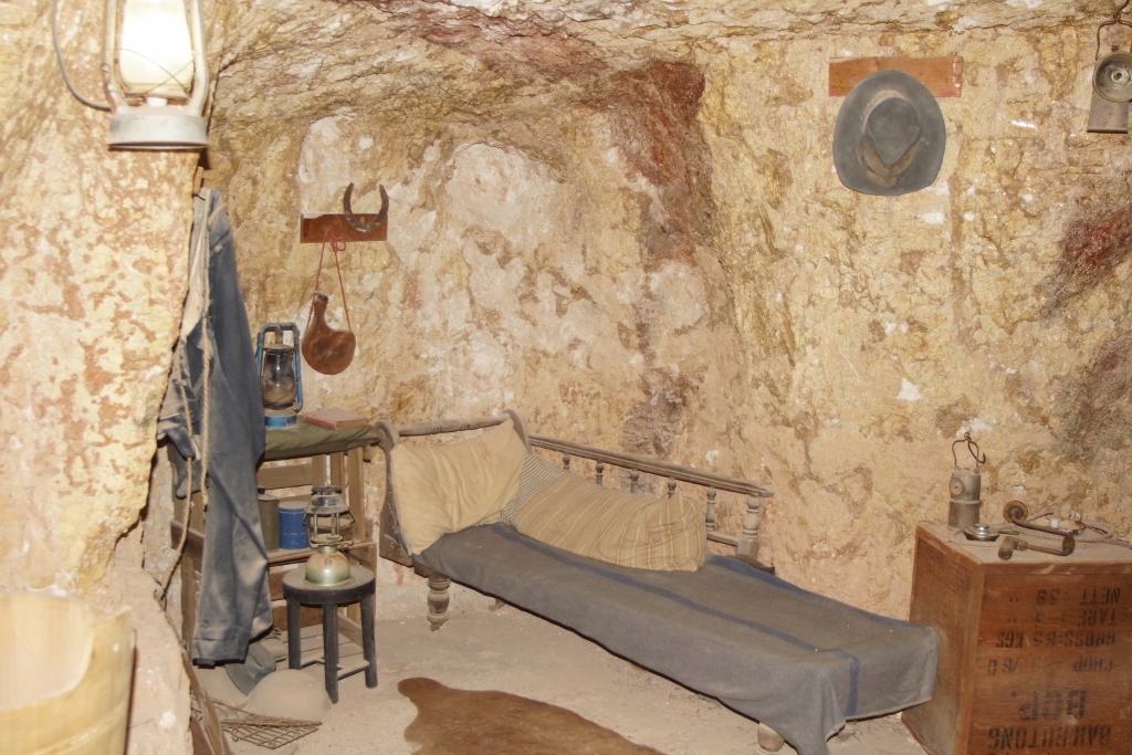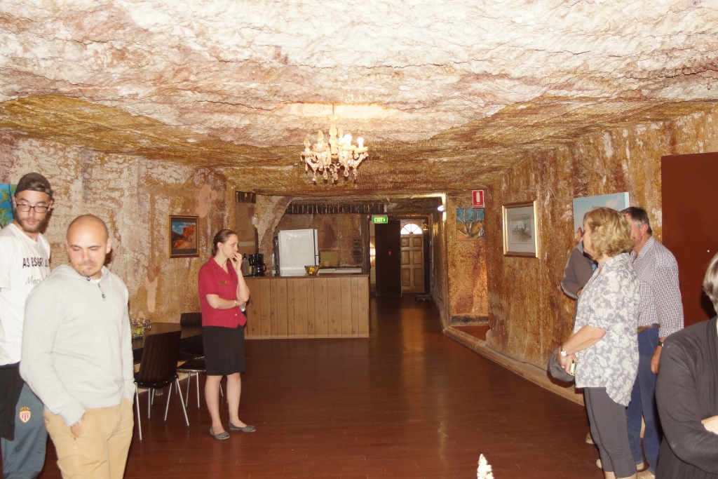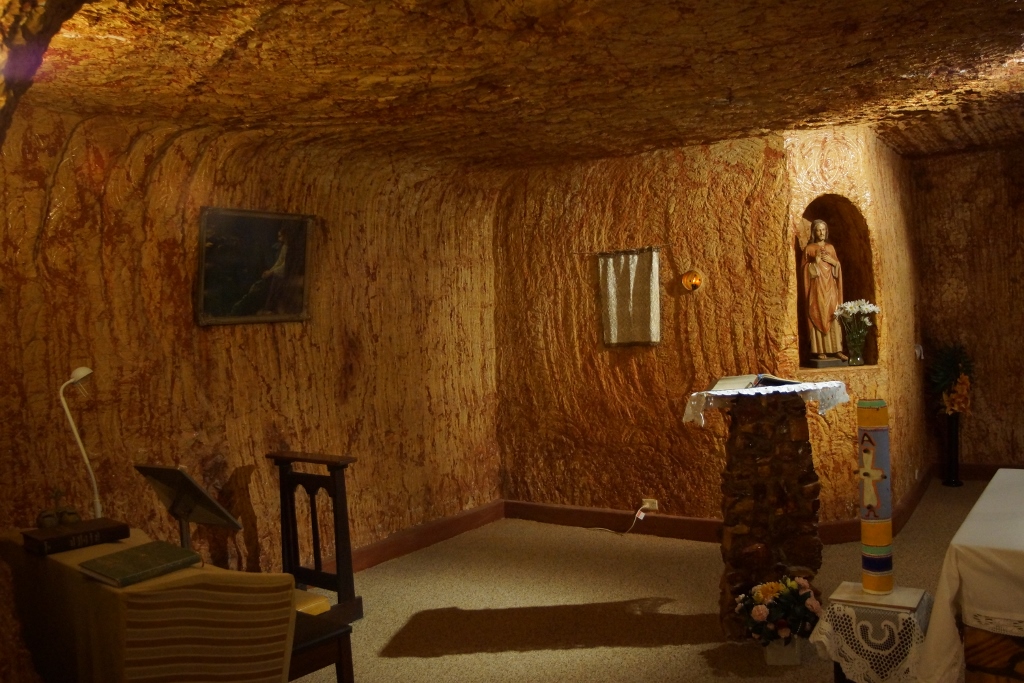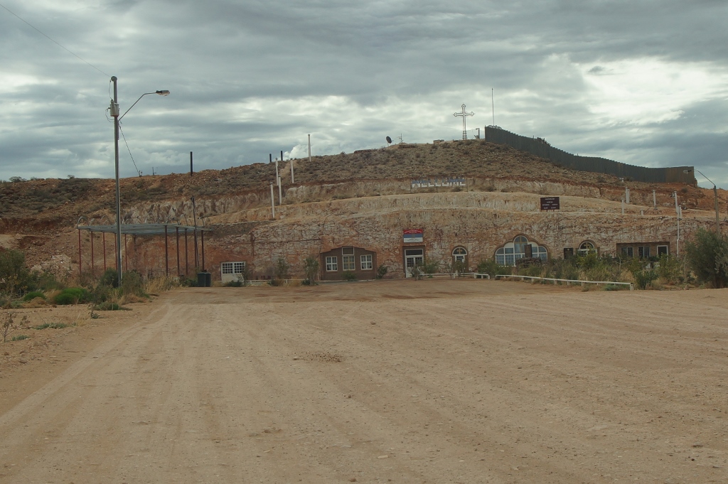 That was Tuesday. Wednesday was spent replacing a tyre and there went another $230.00 for a non matching one. But a look at some of the spots of interest around CP salved the angst of painful expenditure. The Umoona Opal Mine, museum and underground houses, the Serbian and Catholic underground churches and the big hotel did a lot to assuage the pain. It is truly amazing how the locals have adapted over the years. Apparently the white population all lives underground in climactic conditions which see 54′ at the top to -1′ at the bottom. The underground temperature sits at about 22′ all year round. It seems the indigenes believe underground is bad. This must be so cos they wander the streets at all hours of the day and night. Most of the significant dwellings and commercial premises are dug by machine but many of the older habitats are pick and shovel exercises. Coober Pedy is notable for the development of specialised equipment to carry out the mining task such as the little digger tractor and the giant vacuum cleaner. The tunnel mazes are mind boggling. Interesting now though is since 1972 no mining is allowed within the town boundaries, but nothing prevents you from digging another bedroom (or two) . No explosives though and we’re told you’re not even allowed to take explosives into the drive-in theatre cos you mightn’t like the film. When you see the underground mazes you are truly overawed at the tenacity of these miners…..