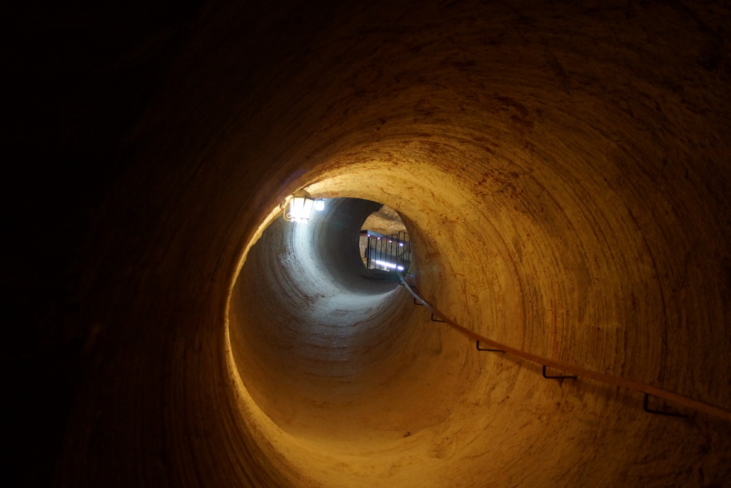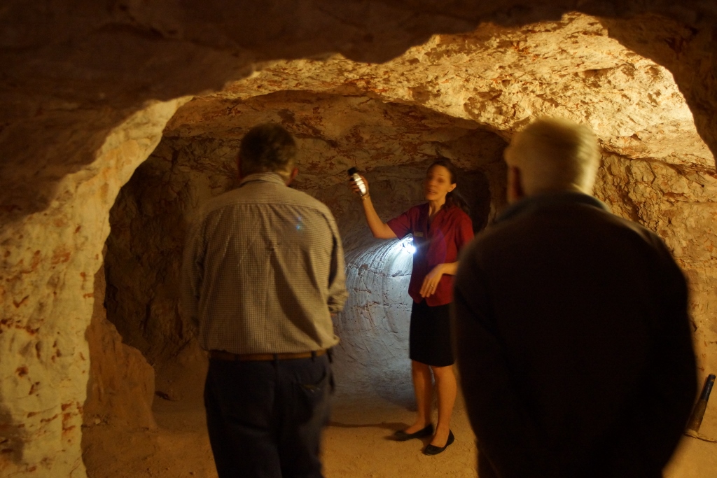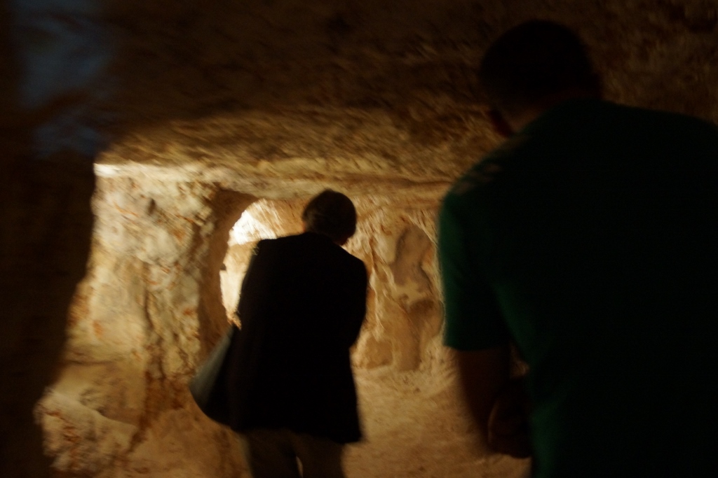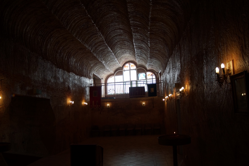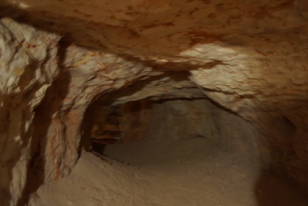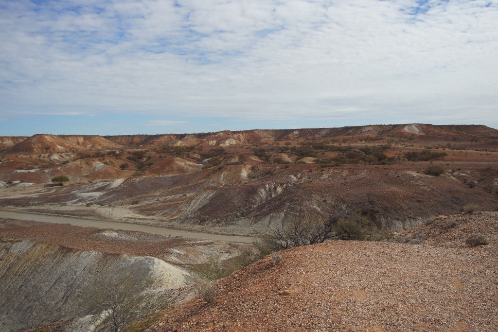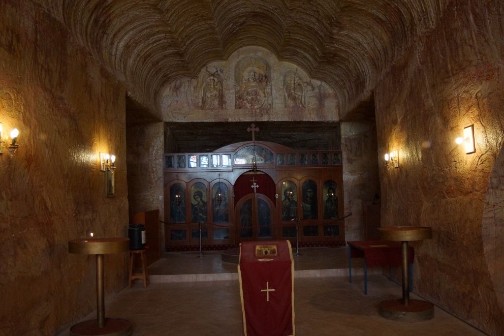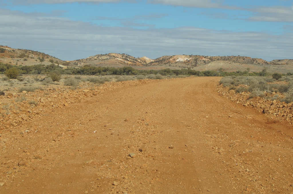 That was Tuesday. Wednesday was spent replacing a tyre and there went another $230.00 for a non matching one. But a look at some of the spots of interest around CP salved the angst of painful expenditure. The Umoona Opal Mine, museum and underground houses, the Serbian and Catholic underground churches and the big hotel did a lot to assuage the pain. It is truly amazing how the locals have adapted over the years. Apparently the white population all lives underground in climactic conditions which see 54′ at the top to -1′ at the bottom. The underground temperature sits at about 22′ all year round. It seems the indigenes believe underground is bad. This must be so cos they wander the streets at all hours of the day and night. Most of the significant dwellings and commercial premises are dug by machine but many of the older habitats are pick and shovel exercises. Coober Pedy is notable for the development of specialised equipment to carry out the mining task such as the little digger tractor and the giant vacuum cleaner. The tunnel mazes are mind boggling. Interesting now though is since 1972 no mining is allowed within the town boundaries, but nothing prevents you from digging another bedroom (or two) . No explosives though and we’re told you’re not even allowed to take explosives into the drive-in theatre cos you mightn’t like the film. When you see the underground mazes you are truly overawed at the tenacity of these miners…..