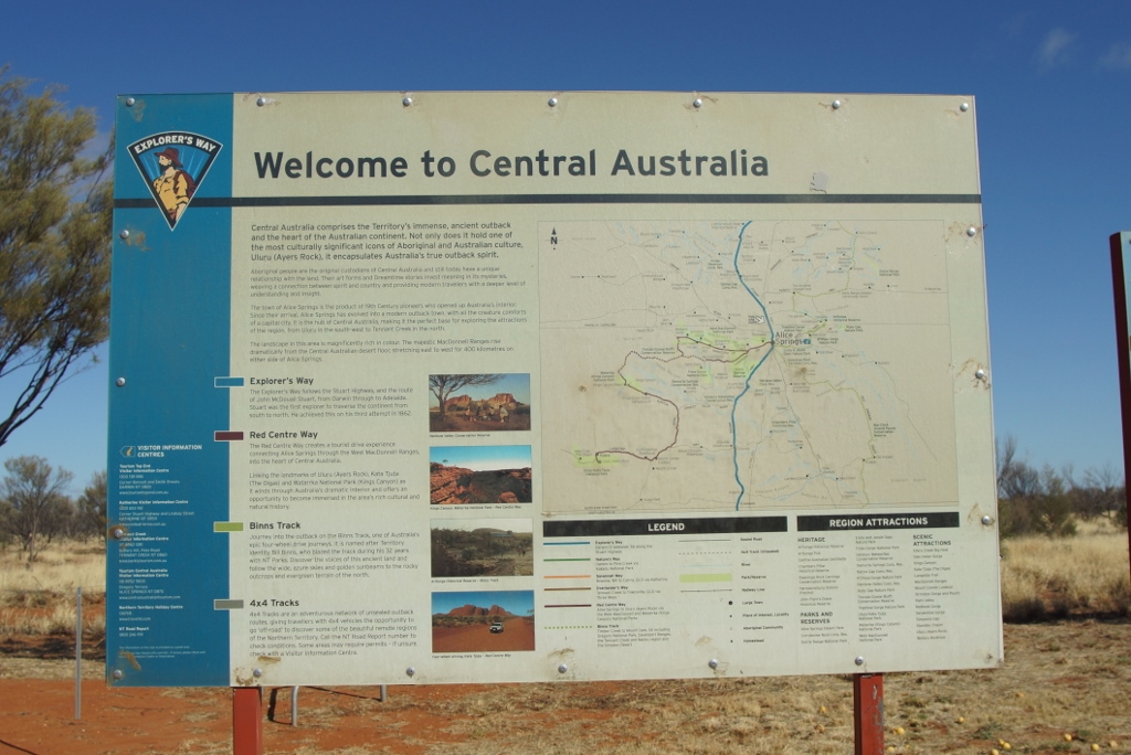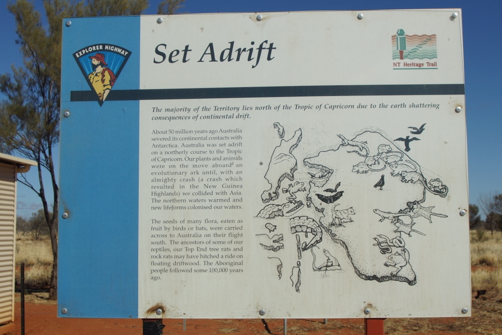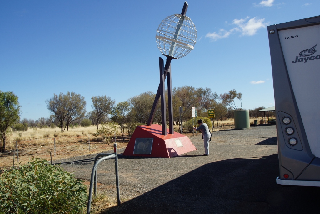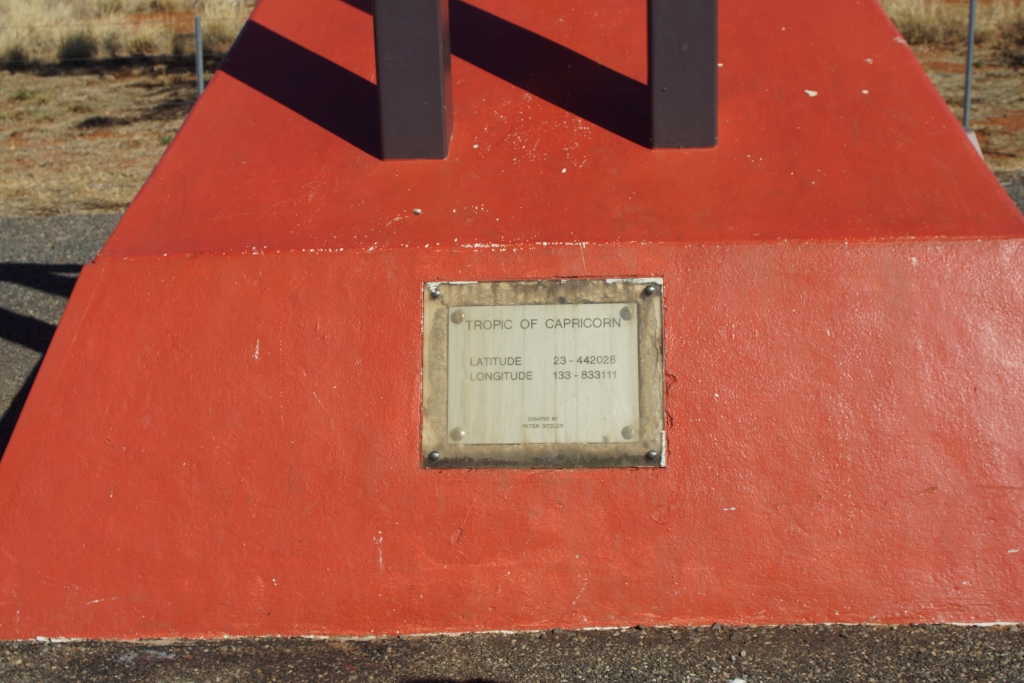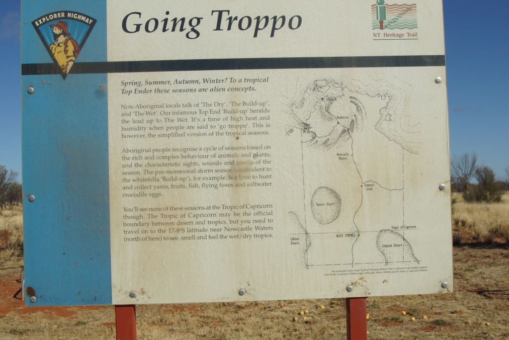 We left Alice and headed north again on Tuesday (I think). The Stuart highway is a bit like the Hume – boring, although its only two lanes. If we were driving something different it might be OK but 130 in the truck is not fun. There are also some unrestricted bits of the road. Would you believe there is no outdoor advertising in this state. But there was a bit of a break crossing the “tropic of Capricorn”……