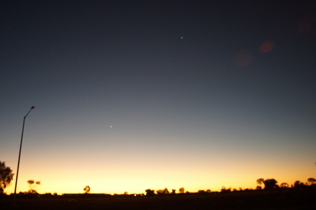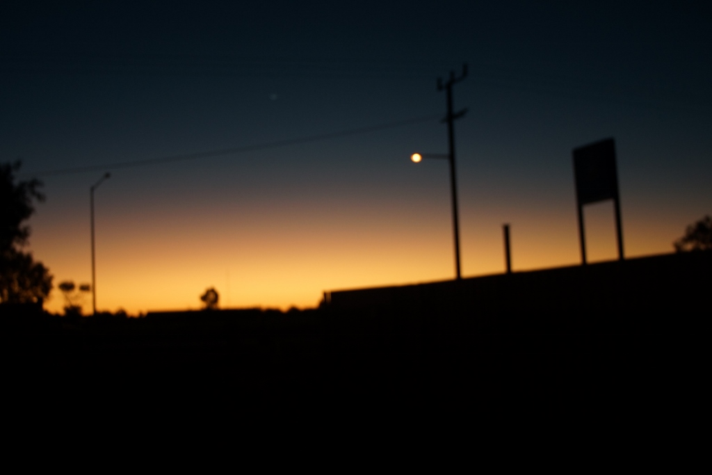 Back to the highway and on to Aileron, the next spot on the map. Roadhouse, caravan park and hordes of non-reflective people milling about with slabs for deodorant (underarm that is). Didn’t appeal as an overnight so on to Ti-Tree, just a bit further up. Another roadhouse but slightly more enticing. After dinner guest from Germany, Melanie, entertained with stories of her love life, travels and mishaps. Travelling by herself now from Darwin she was in a rental campervan, going on to Alice and then back. Had already done the east coast. Tried for another sunset shot … failed again but the dusk sky was interesting….