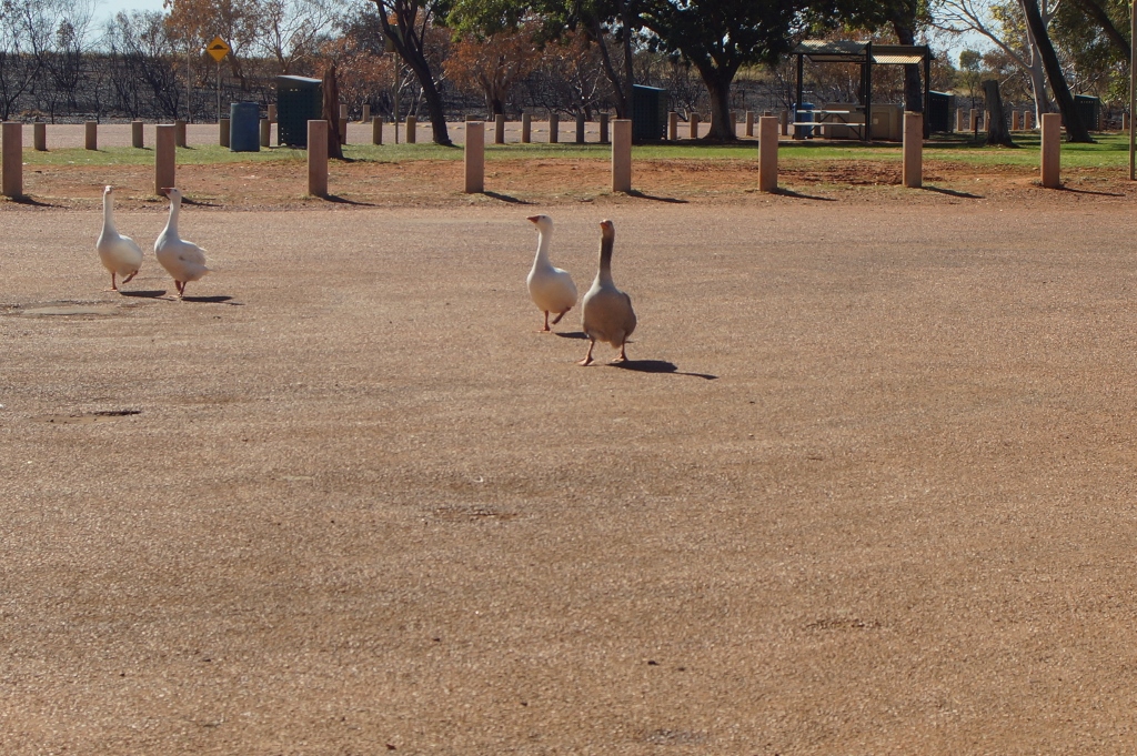 Onwards, ever onwards. Tennant Creek next, small town with shops and all, but clearly a very high indigenous population. Out to the visitor information centre east of town which really didn’t help our decision making. A mine tour was on offer at $49.00 per head if we chose to wait around for a couple of hours but having done other such tours over past years it didn’t have a lot of appeal so we moved on to the local water supply where we were attacked by a flock of killer geese (although they became friendly enough after I took their photos) and then to the old Tennant Creek telegraph station……