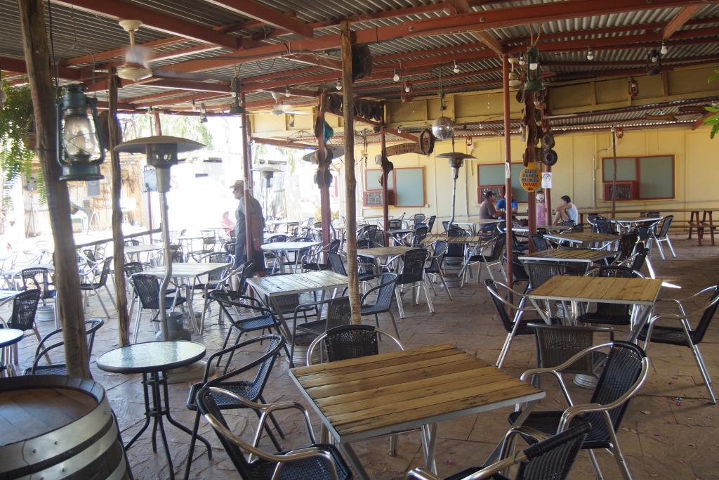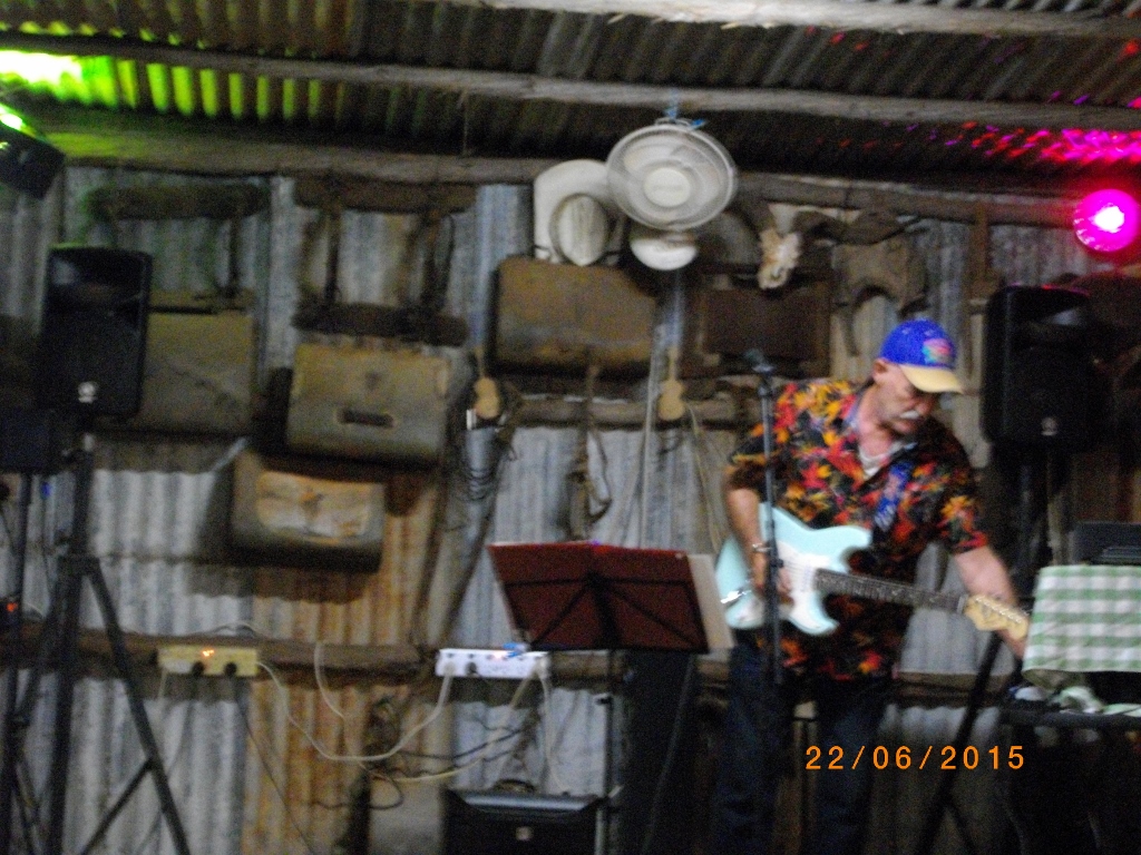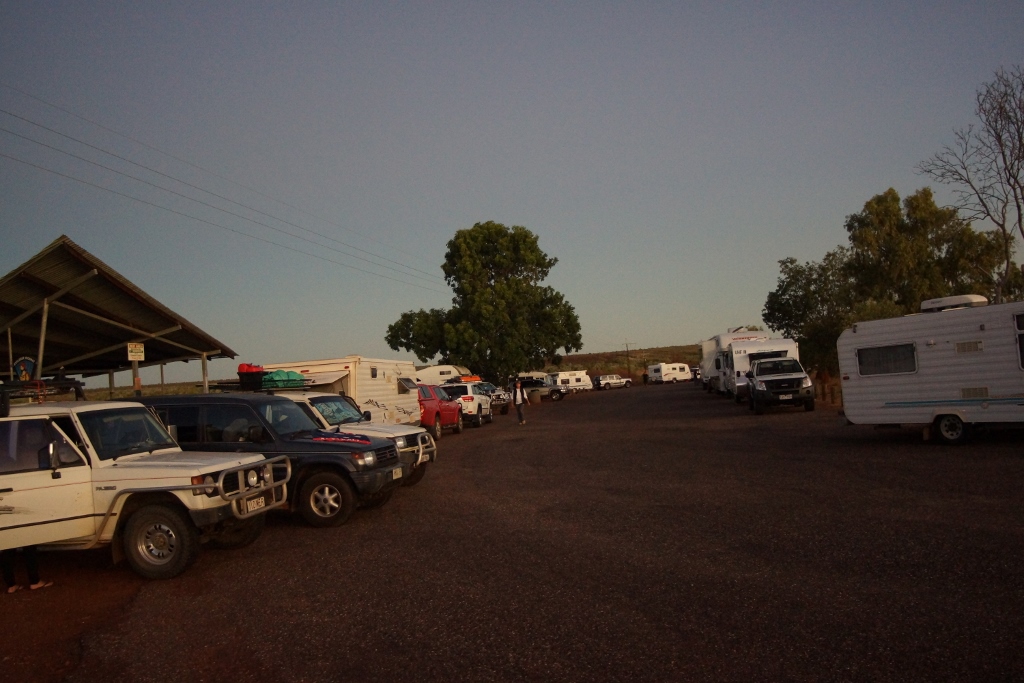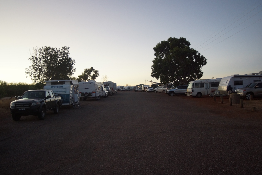 Well we still had time to make Daly Waters before lunch but it was a race and bugger me there was a bloody queue. Finally we made the head of the queue whereupon we were asked to order dinner along with our park booking and we also had to decide which sitting we required. WTFRwe. This popular?. Well as afternoon drifted on so too did new arrivals until eventually they were parked up in the roadways. We chose the 6.30 sitting cos the music started up at 6.00 but we could have gone 7.00, 7.30 or 8.00 and the crowds moved through. Our Colin from the night before was the opening act, eventually followed by another guy whose name escapes me but it was good music throughout. The pub is famous for its Barra and Beef dish but the girls went just for barra but I had to do both. Twas good tucker and absolutely worth the fare. I must add that the hospitality is phenomenal. Upon booking in and our food order taken we left the bar to return to the vehicle some distance away and the waiter came trotting after us. He had forgotten to ask how my steak was to be done! Then we were directed into our sites by Ed on his bike…..