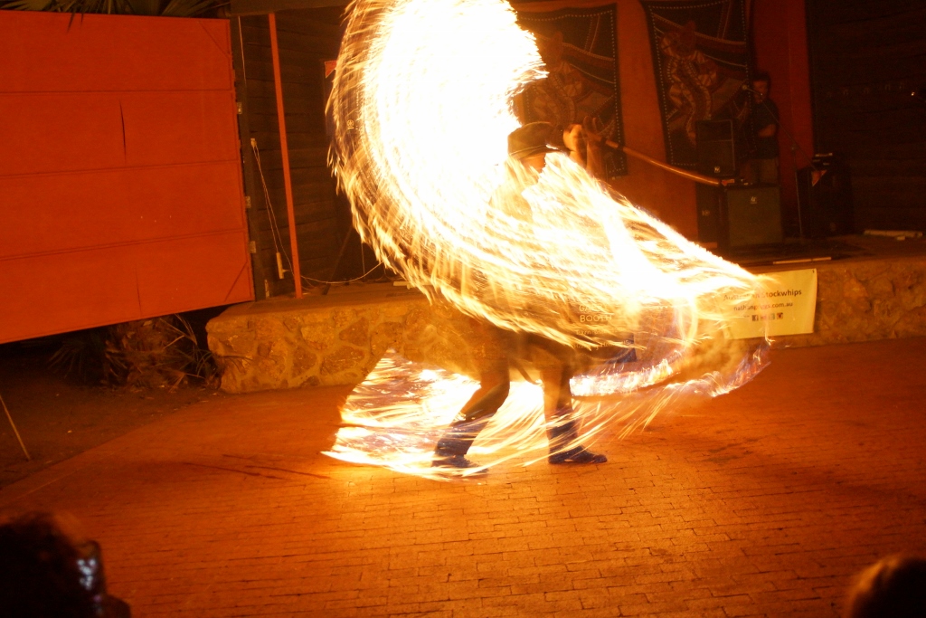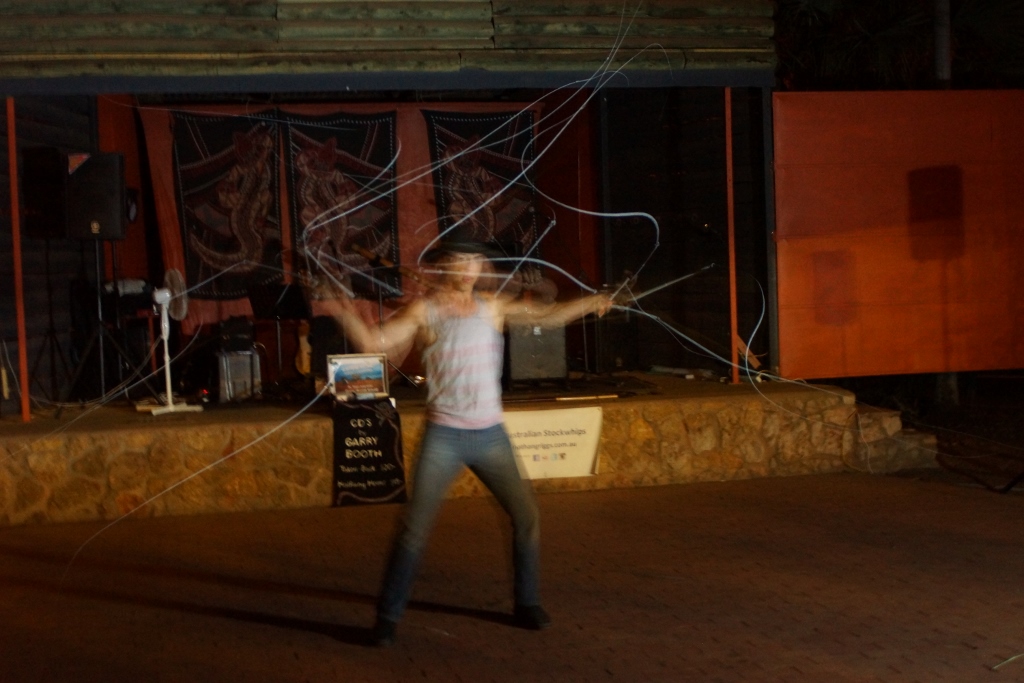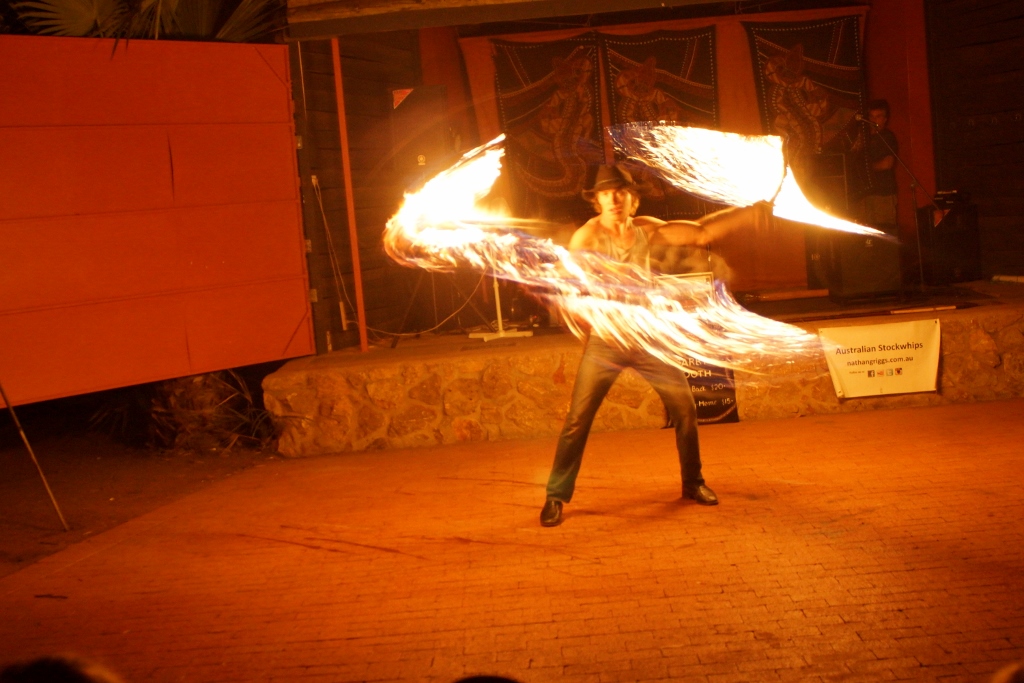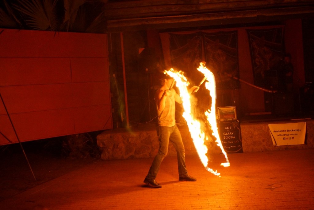 Mataranka hot tubs call us onwards. Again ya gotta get in early to savour this experience although it turned out to be not quite as critical as Daly Waters. We actually bared the soul (or is that ar…) later in the day and again the following day to partake of the aerated waters of the Mataranka hot springs. But, the highlight was the dinner show. Main meals $16.50 quickly delivered, happy hour 20% off all drinks 5 – 6, and singers and a whip cracker all beside a blazing campfire through the evening. The shows were great. The second night featured our newest best friend Colin followed again by the whipcracker….