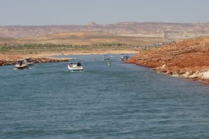 The Colorado river is dammed here and still again further down at the other end of the Canyon. The resulting waterway (Lake Powell) is 198 miles long but only about 2 – 3 miles wide but quite a bit narrower at some points. The setting is quite stunning….