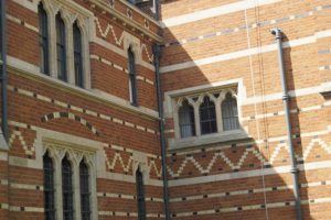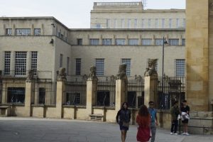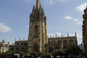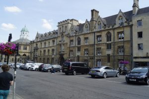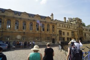 which dropped us off opposite the above building which features a statue up top of Cecil Rhodes who amongst other things founded Rhodesia (now of course Zimbabwe) and provided funding for the foundation of the Rhodes Scholarship to which 83 persons are admitted each year. Having been dropped off here we then partook of a foot tour of one of the oddest parts of Oxford…