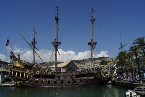 but it is only a film set for the movie “Pirates” moored permantly in the harbour.