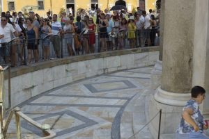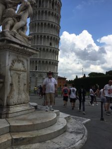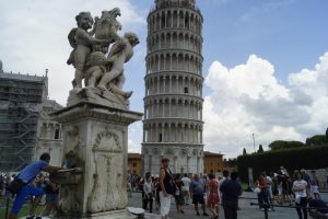 but of course the star attraction in all of this is ‘The Leaning Tower of Pisa’. Without trying to diminish its signifigance it is just the ‘bell tower’ for the cathedral (completed 1092)- it was started in about 1173 but not completed for a further 200 years as it started t0 lean as the builders reached the fourth level. Sometime later its lean stabilised so they started again but it leant further and so construction was stopped (although there are some politics involved in this stop/start) again. During a third attempt to complete it they built the next levels at a cant to try and counter the lean but over the ensuing years it took on a greater lean and actually sank into the ground so that level one is actually below ground level..